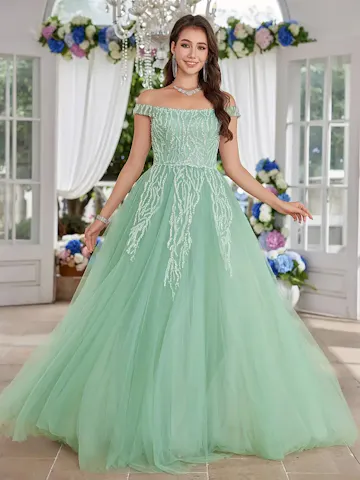 Women’s Elegant Handmade Floral Off-Shoulder/One-Shoulder Evening Gown | Floor-Length Mint Green Formal Dress with Train and Fitted Silhouette | Perfect for Weddings, Parties, and Formal Events | Luxurious Hand-Washable Design